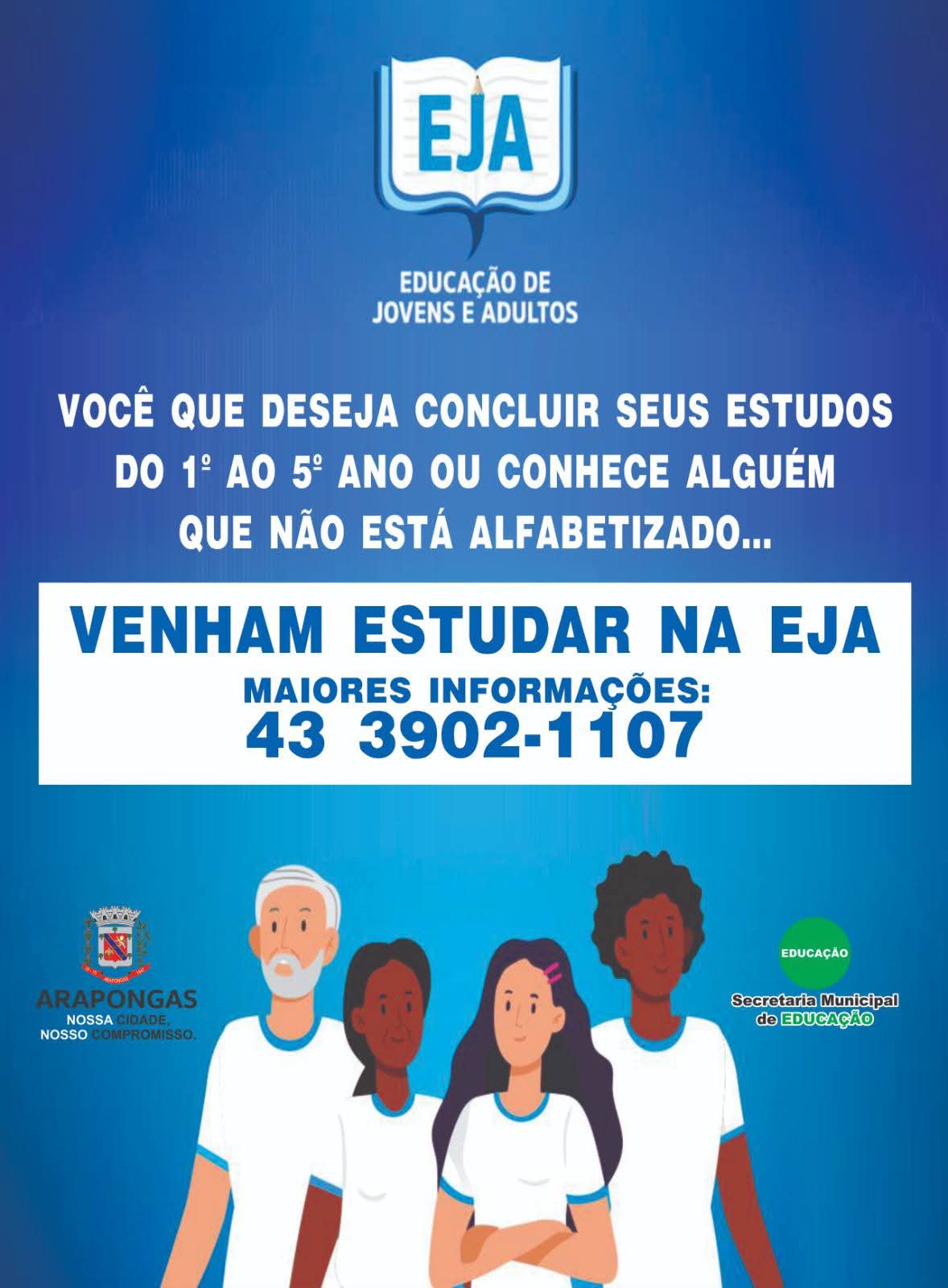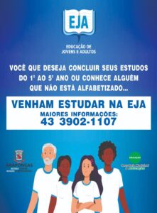 A Prefeitura de Arapongas, por meio da Secretaria Municipal de Educação, informa que estão abertas as inscrições para o programa de Educação de Jovens e Adultos (EJA), destinado a quem deseja cursar do 1º ao 5º ano do Ensino Fundamental. A iniciativa visa garantir o acesso à educação básica a pessoas que, por diferentes motivos, não tiveram a oportunidade de estudar na idade regular.