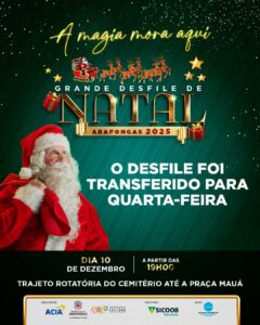 A Prefeitura de Arapongas, por meio da Secretaria Municipal de Cultura, Lazer e Eventos (SECLE), e a Associação Comercial e Empresarial de Arapongas (ACIA) informam que a primeira apresentação do Grande Desfile de Natal de Arapongas foi adiada para quarta-feira, 10. A atração natalina, inicialmente prevista para a noite desta segunda-feira, 08, foi transferida em razão da previsão de chuva.