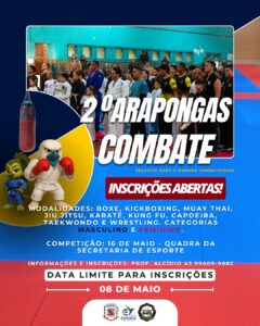 Estão abertas até o dia 8 de maio as inscrições para a 2ª edição do Arapongas Combate. Promovido pela Prefeitura de Arapongas, por meio da Secretaria Municipal de Esporte, o evento será realizado em 16 de maio, no Ginásio da Secretaria de Esporte (antigo Sesi).