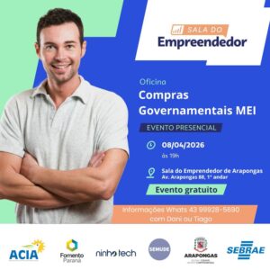 A Prefeitura de Arapongas, por meio da Sala do Empreendedor e da Secretaria Municipal de Desenvolvimento, Inovação, Trabalho e Renda (SEMUDE), realiza na próxima quarta-feira (08), às 19h, a “Oficina de Compras Governamentais para MEI”. O evento é gratuito e acontecerá na Sala do Empreendedor.