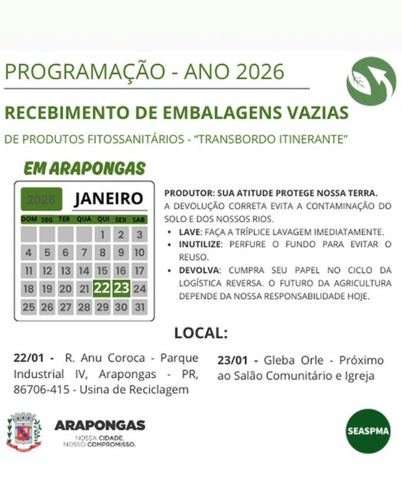 A Prefeitura de Arapongas, por meio da Secretaria Municipal de Agricultura, Serviços Públicos e Meio Ambiente (SEASPMA), realiza nesta semana o recebimento de embalagens vazias de produtos fitossanitários. A iniciativa será feita por meio de duas ações de transbordo itinerante, voltadas aos produtores rurais do município.