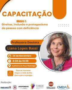 A Prefeitura de Arapongas, por meio da Secretaria Municipal de Políticas Públicas para a Mulher e Pessoa com Deficiência (SEMUPE), promove na próxima segunda-feira, 24, das 08h30 às 13h30, a capacitação “Direitos, inclusão e protagonismo da pessoa com deficiência”, no auditório do Paço Municipal, localizado na Rua das Garças, nº 750, no Centro. Esta é a primeira etapa de um ciclo composto por quatro módulos, previstos para ocorrer ao longo dos próximos meses.