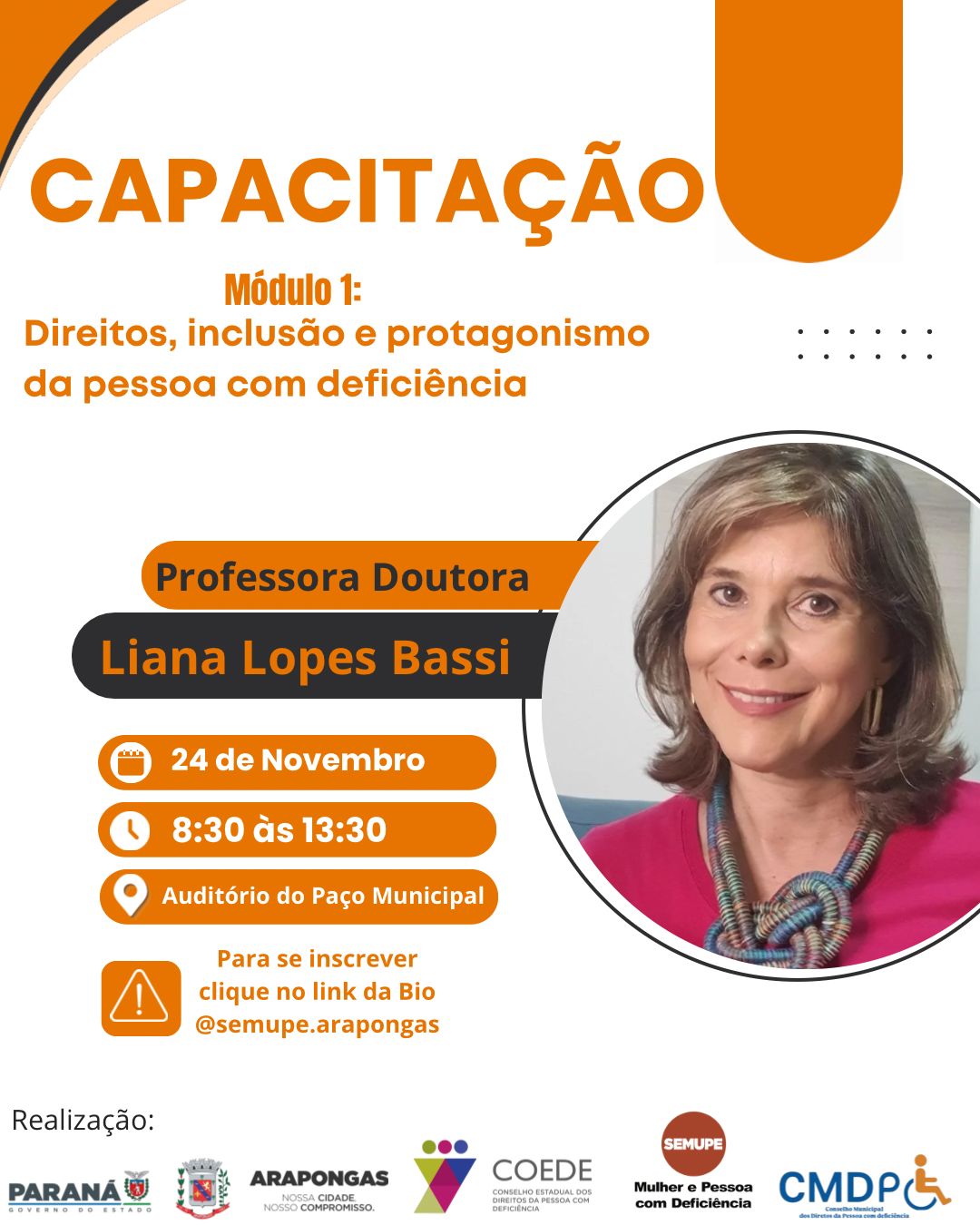 A atividade será conduzida pela professora Liana Lopes Bassi, assistente social e pesquisadora com ampla experiência em políticas públicas. Ela é mestre em Políticas Públicas pela Universidade Estadual de Maringá (UEM), doutora em Serviço Social e Políticas Sociais pela Universidade Estadual de Londrina (UEL), e possui diversas especializações na área. Também atua como coordenadora da seccional Londrina do Conselho Regional de Serviço Social do Paraná (CRESS/PR) e do comitê da Luta Anticapacitista do CRESS-PR. Além disso, é presidente da Federação Paranaense de Síndrome de Down (FEPASD) e vice-presidente da Associação Download de Síndrome de Down em Apucarana. Já integrou o corpo docente da Unespar – Apucarana, UEL e UniCesumar.