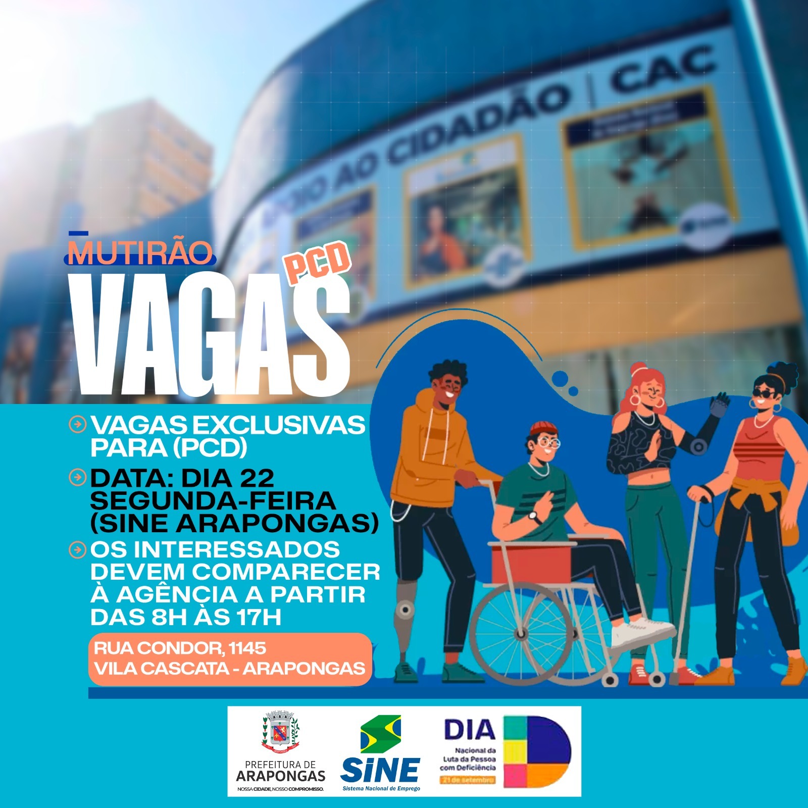 A Prefeitura de Arapongas realiza, na próxima segunda-feira (22), um mutirão de vagas de emprego exclusivas para Pessoas com Deficiência (PCD). A iniciativa acontece das 08h às 17h, na Agência do Trabalhador de Arapongas, localizada na Rua Condor, nº 1145 – Vila Cascata.