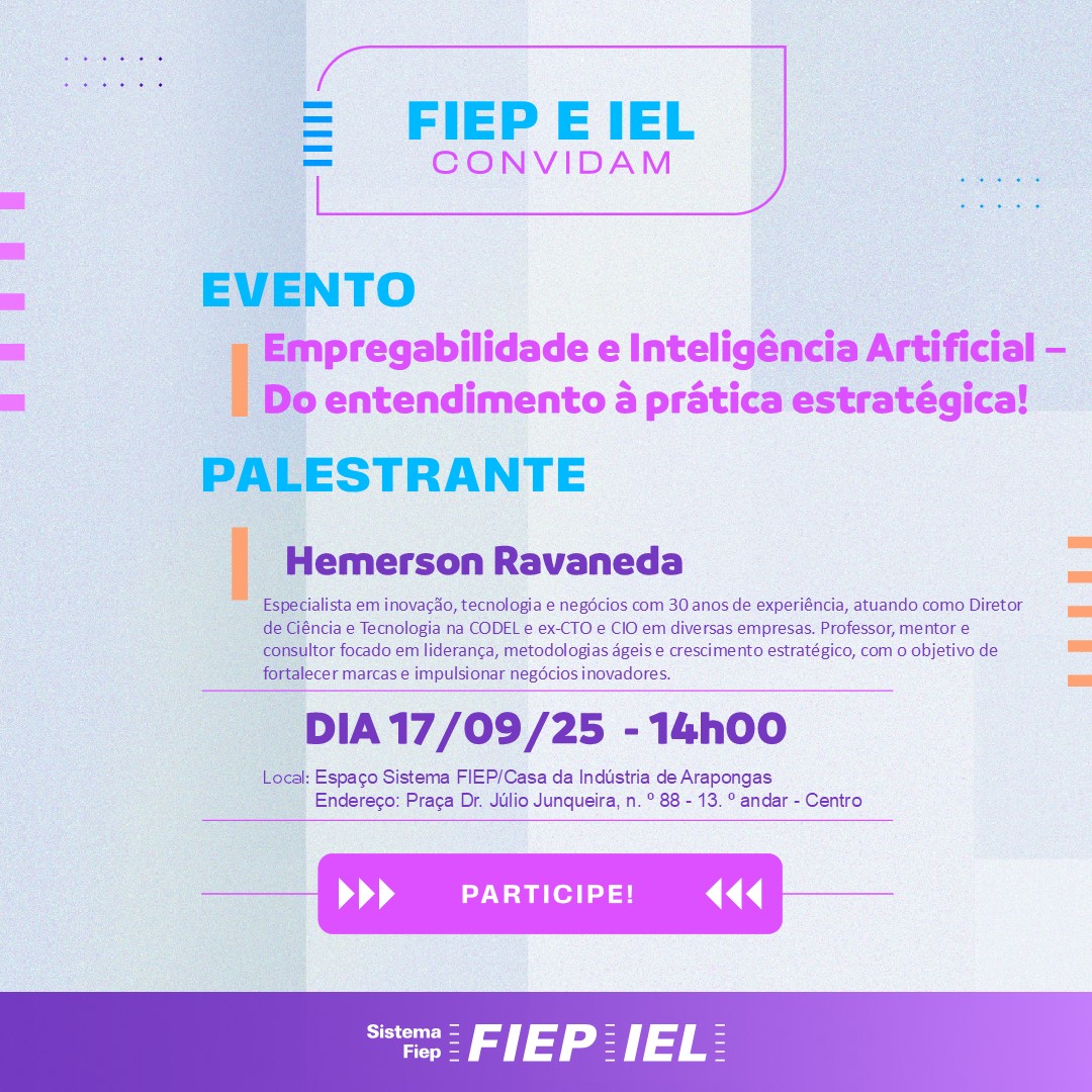 Capacitação abordará como aplicar a Inteligência Artificial de forma estratégica para aumentar a empregabilidade. Evento será ministrado pelo consultor Hemerson Ravaneda, com apoio da Prefeitura e promoção da FIEP e do IEL. Encontro acontece nesta quarta-feira, 17, às 14h, no Espaço Sistema Fiep/Casa da Indústria.