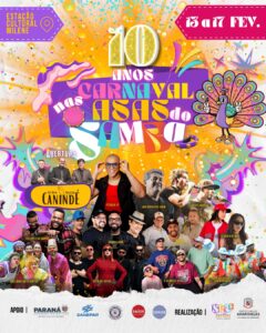 O Carnaval de Arapongas “Nas Asas do Samba” comemora, em 2026, seus 10 anos com uma programação especial, diversa e pensada para públicos de todas as idades. A festa será realizada entre os dias 13 e 17 de fevereiro, reunindo música, cultura, alegria e atividades para toda a família, além de reafirmar o carnaval como uma das mais importantes manifestações culturais do município. O evento é promovido pela Prefeitura de Arapongas, por meio da Secretaria Municipal de Cultura, Lazer e Eventos (SECLE).