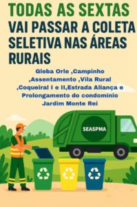 A Prefeitura de Arapongas, por meio da Secretaria Municipal de Agricultura, Serviços Públicos e Meio Ambiente (Seaspma), informa que a coleta seletiva vai passar a ser semanal – todas as sextas-feiras – em áreas rurais do município, a partir do dia 01 de agosto. Anteriormente, o serviço era quinzenal.