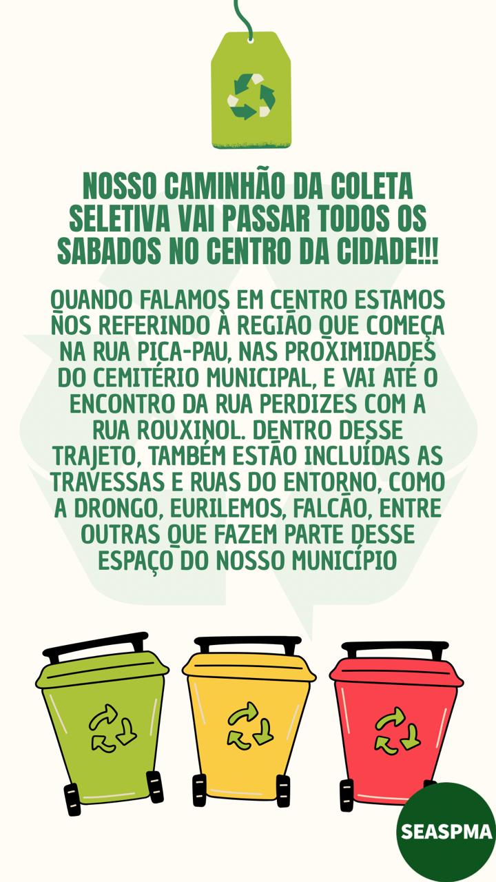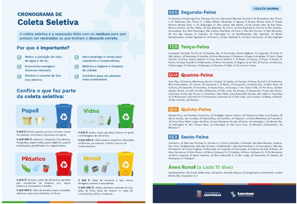 Outra novidade é a coleta seletiva aos sábados na região central de Arapongas. A área atendida começa na Rua Pica-Pau, nas proximidades do Cemitério Municipal, até o encontro da Rua Perdizes com a Rua Rouxinol, incluindo ruas e travessas do entorno, como a Rua Drongo, Eurilemos e Falcão.
