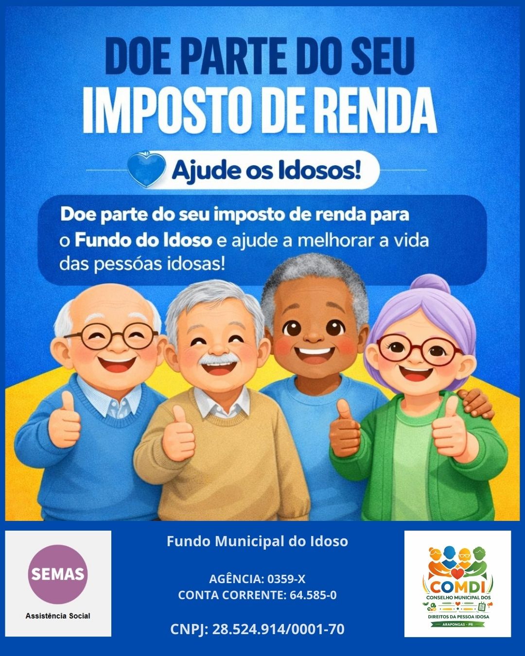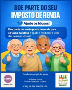 Parte do Imposto de Renda (IR) devido pelos contribuintes pode ser destinada ao Fundo Municipal dos Direitos do Idoso de Arapongas. A iniciativa permite que recursos que iriam para a União permaneçam no município, fortalecendo projetos sociais voltados à população idosa.