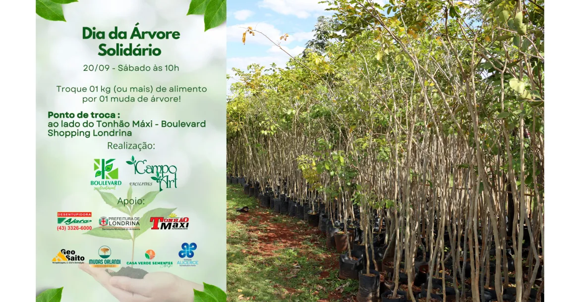 Para celebrar o Dia da Árvore, que é comemorado em 21 de setembro, o Boulevard Londrina Shopping, em conjunto com a Campo Art, promove neste sábado (20) uma ação solidária que permite ao público trocar 1 quilo de alimento não perecível por uma muda de árvore. A troca será feita no piso térreo do Boulevard, ao lado do supermercado Tonhão Máxi, com início às 10h e encerramento previsto para as 19h.