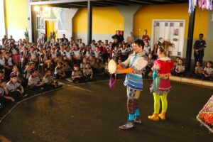 O espetáculo, de caráter lúdico e poético, celebra a força da arte popular e a tradição das pernas de pau, marcando presença com figurinos coloridos, música e interação com o público. Cerca de 120 estudantes prestigiaram a apresentação, representando as escolas Professora Aleydah Costa Santos Oliveira, Professor José de Carvalho, Cívico Disciplinar Profª Alzira Horvatich e o Colégio Estadual Antonio Racanello Sampaio. O evento também contou com a presença do secretário de Cultura, Lazer e Eventos, Pedro Ziroldo, e da vice-prefeita Édina Kümmel, que acompanharam a atividade e interagiram com os alunos durante o espetáculo.