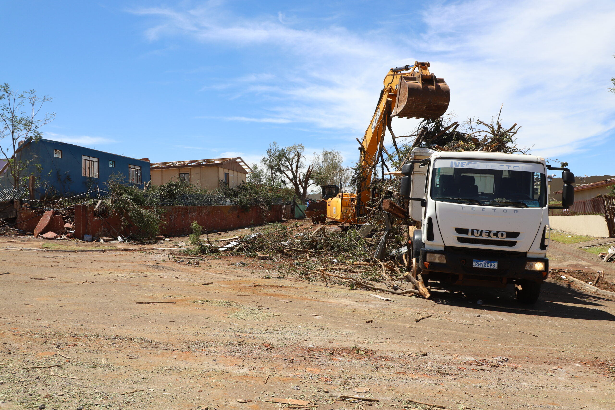 O Governo do Estado do Paraná está mobilizando um grande aparato de maquinários e equipes para o trabalho de limpeza e remoção de entulhos em Rio Bonito do Iguaçu, município atingido por um tornado com ventos de até 250 km/h na última sexta-feira (7).