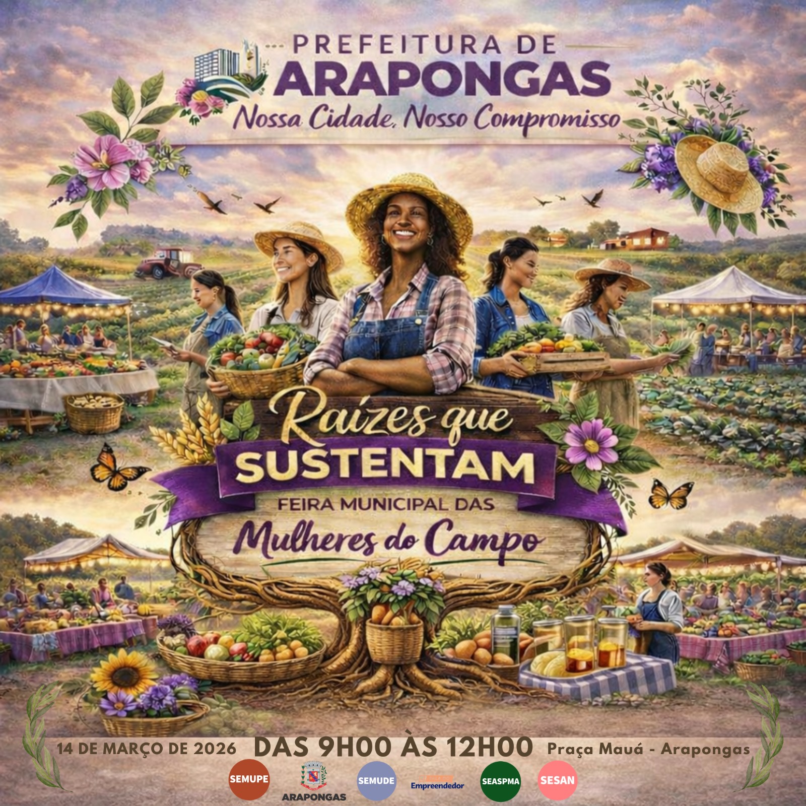 A Prefeitura de Arapongas promove, neste sábado (14), a Feira Municipal das Mulheres do Campo, com o tema “Raízes que Sustentam”. O evento será realizado na Praça Doutor Júlio Junqueira (Praça Mauá), das 9h às 12h, reunindo produtoras rurais e a comunidade em uma manhã dedicada à valorização da agricultura familiar e ao fortalecimento do trabalho feminino no campo.