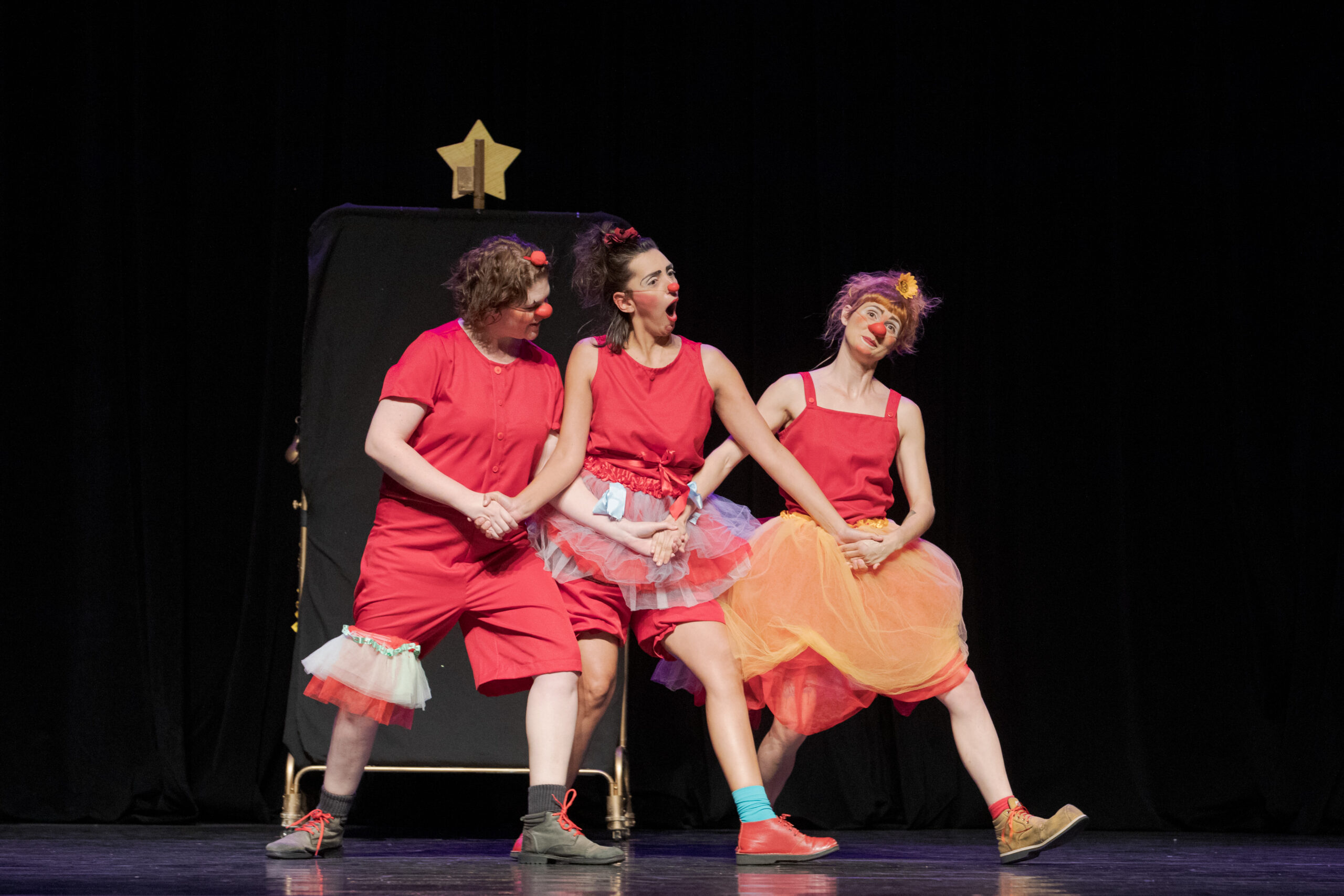 Em cena, as palhaças Adelaide, Cora e Frida transformam a dança em uma sequência de situações cômicas. Com coreografias que misturam gingado, improviso e trapalhadas, o trio mostra que dançar é para todos, sem limites de estilo ou técnica. O elenco é composto por Aneliza Paiva, Juliana Galante e Mariana Ferrari, com direção de Gerson Bernardes e consultoria em dança de Cláudio de Souza.