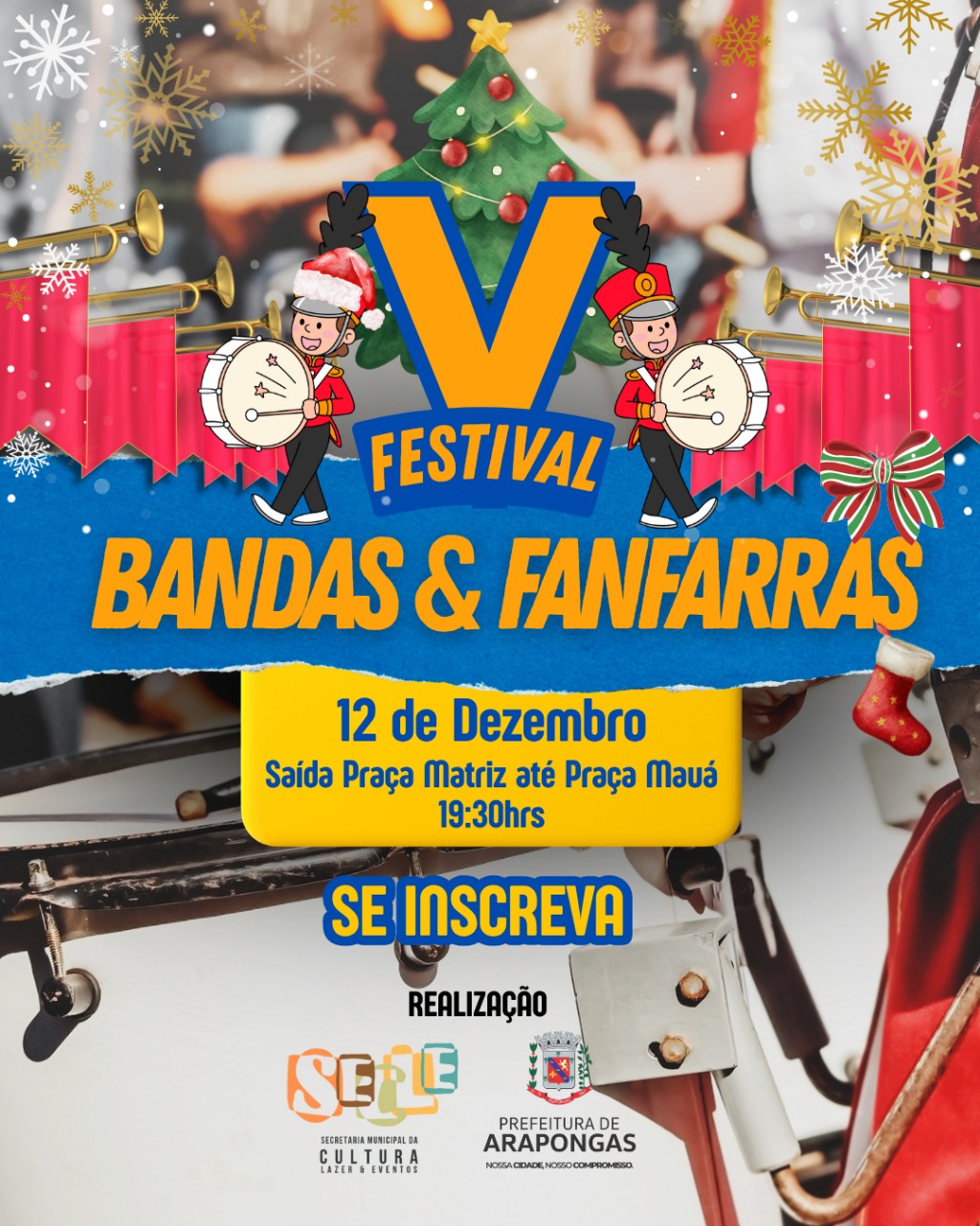 A Prefeitura de Arapongas, por meio da Secretaria de Cultura, Lazer e Eventos (SECLE), informa que seguem abertas as inscrições para o V Festival de Bandas & Fanfarras, que promete movimentar a Avenida Arapongas com ritmo, cor e muita música. O evento está marcado para o dia 12 de dezembro e percorrerá o trajeto da Praça do Santuário Nossa Senhora Aparecida (Igreja Matriz) até a Praça Doutor Júlio Junqueira (Praça Mauá).