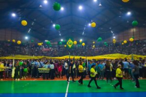 A solenidade de abertura dos 72º Jogos Escolares do Paraná – Fase Municipal lotou o Ginásio de Esportes Luiz Augusto Zin, em Arapongas, na noite de segunda-feira (06). O evento reuniu estudantes, familiares, professores e representantes das instituições participantes, além do superintendente-geral de Apoio aos Municípios da Casa Civil, Sérgio Onofre, secretários, servidores municipais e outras autoridades.