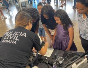 A programação do evento contou ainda com demonstrações de perícia papiloscópica — técnica usada para coletar impressões digitais —, exposições de equipamentos táticos utilizados pela instituição e atividades educativas voltadas às crianças.