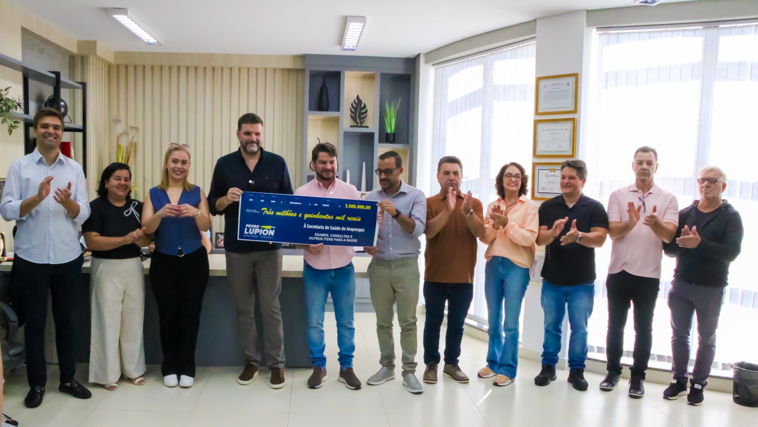 Nesta quinta-feira, 20, o prefeito de Arapongas, Rafael Cita, recebeu no gabinete o deputado federal Pedro Lupion (PP/PR). Na oportunidade, ele oficializou a entrega de recursos na ordem de R$ 3,5 milhões a serem aplicados para o fortalecimento de serviços da Secretaria Municipal de Saúde e outros R$ 600 mil para a Santa Casa. O ato também foi acompanhado pela vice-prefeita Édina Kummel, pelo ex-prefeito de Arapongas, Sérgio Onofre, secretário de Saúde, Carlos Eduardo Arruda, demais secretários municipais, pelo presidente da Câmara, Márcio Nick, vereadores da base aliada e outras lideranças.