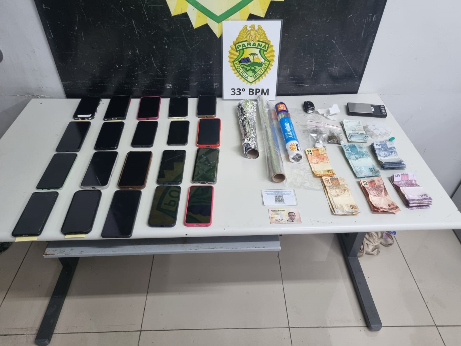A ação foi desencadeada após uma das vítimas acionar a PMPR e fornecer o rastreamento do aparelho, que indicava a localização próxima a um veículo Hyundai HB20. Na abordagem, os policiais identificaram cinco suspeitos dentro do automóvel e localizaram os aparelhos escondidos sob as roupas de um deles. Também foram apreendidos R$ 1.218,00 em espécie, R$ 8.000,00 em pesos colombianos e pequenas porções de skunk, maconha e haxixe.