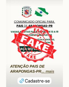 A administração pede atenção redobrada da população para evitar golpes e desinformação. “Qualquer oportunidade promovida pela Prefeitura de Arapongas ou em alguma parceria será divulgada apenas pelos canais oficiais de comunicação – site https://arapongas.atende.net/cidadao/, perfil do Facebook https://www.facebook.com/PrefeituradeArapongas e perfil do Instagram https://www.instagram.com/arapongas_oficial/”, informa a nota.