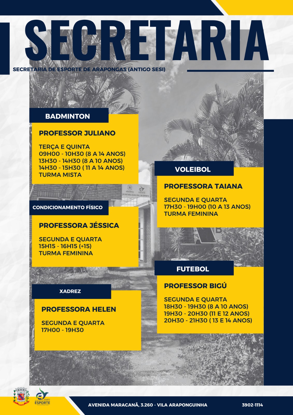A Prefeitura de Arapongas, por meio da Secretaria Municipal de Esporte, divulgou a lista completa com os núcleos, horários e modalidades dos projetos esportivos oferecidos gratuitamente à comunidade. Ao todo, são 20 locais de atendimento distribuídos estrategicamente pelo município, com mais de 20 modalidades disponíveis para a população.