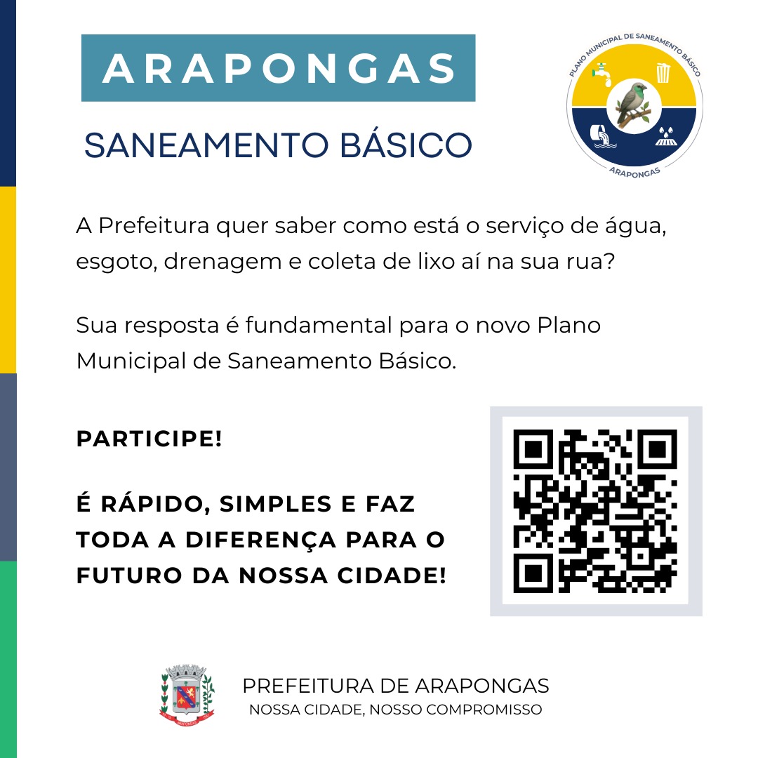 A Prefeitura de Arapongas, por meio da Secretaria Municipal de Agricultura, Serviços Públicos e Meio Ambiente (SEASPMA), convida a população a participar do diagnóstico dos serviços de água, esgoto, drenagem e coleta de lixo no município. A iniciativa tem como objetivo reunir informações que reflitam a realidade vivenciada pelos moradores em diferentes regiões da cidade.