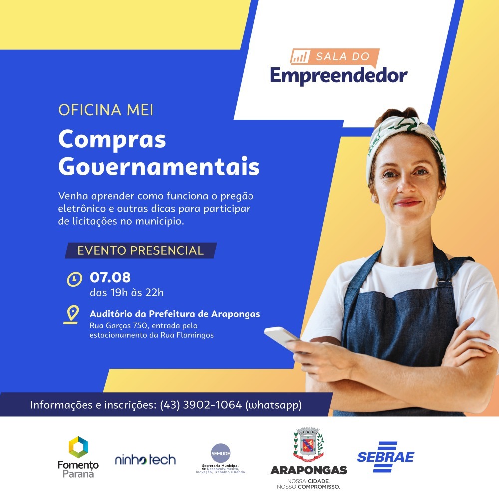 A Prefeitura de Arapongas, por meio da Secretaria Municipal de Desenvolvimento, Inovação, Trabalho e Renda (Semude), promove uma nova edição da oficina para Microempreendedor Individual (MEI) sobre compras governamentais, em parceria com a Sala do Empreendedor e o Serviço de Apoio às Micro e Pequenas Empresas do Paraná (Sebrae/PR).