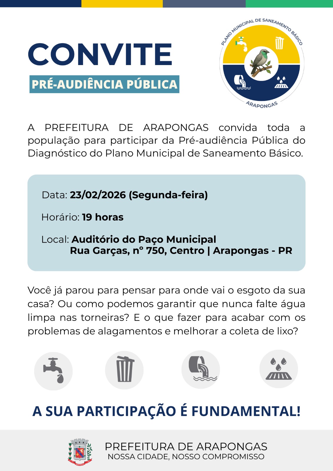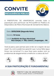A Prefeitura de Arapongas, por meio da Secretaria Municipal de Agricultura, Serviços Públicos e Meio Ambiente (SEASPMA), promove na próxima segunda-feira (23) a Pré-Audiência Pública do Diagnóstico do Plano Municipal de Saneamento Básico. A reunião será realizada às 19h, no auditório do Paço Municipal, localizado na Rua Garças, nº 750, Centro, com entrada pela Rua Flamingos.