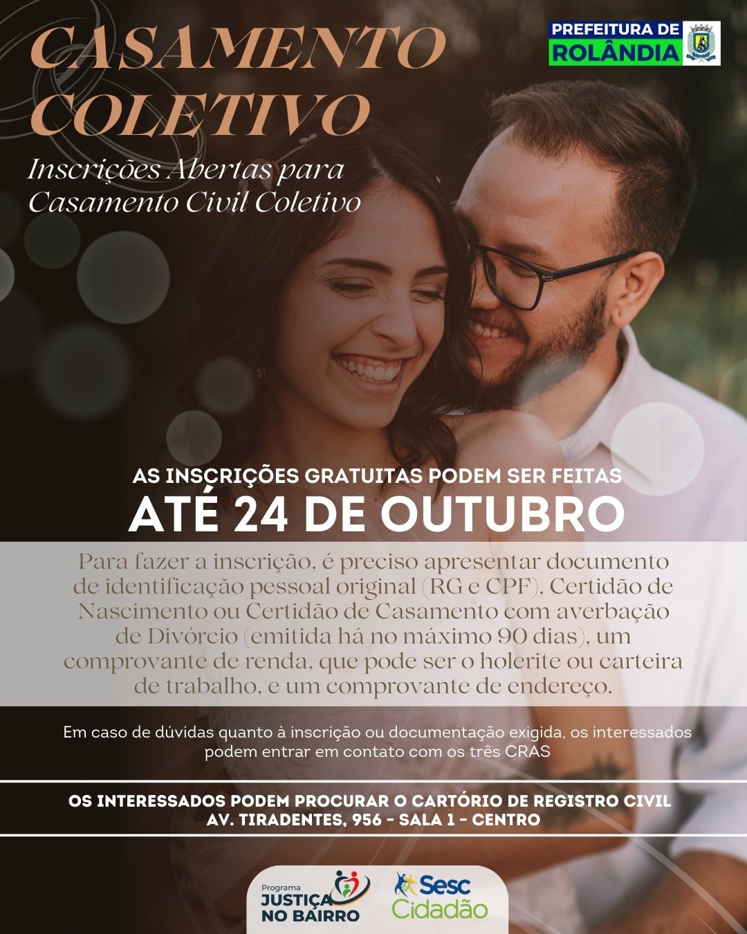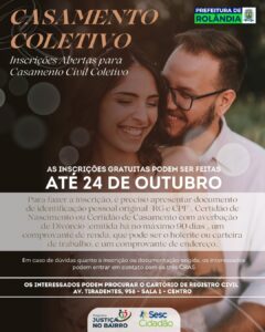 As inscrições gratuitas podem ser feitas até 24 de outubro, para casais com renda máxima de três salários mínimos, e a cerimônia está programada para o dia 1º de novembro, no SESC Londrina Norte, que fica na Avenida Saul Elkind, 1.555, em Londrina.